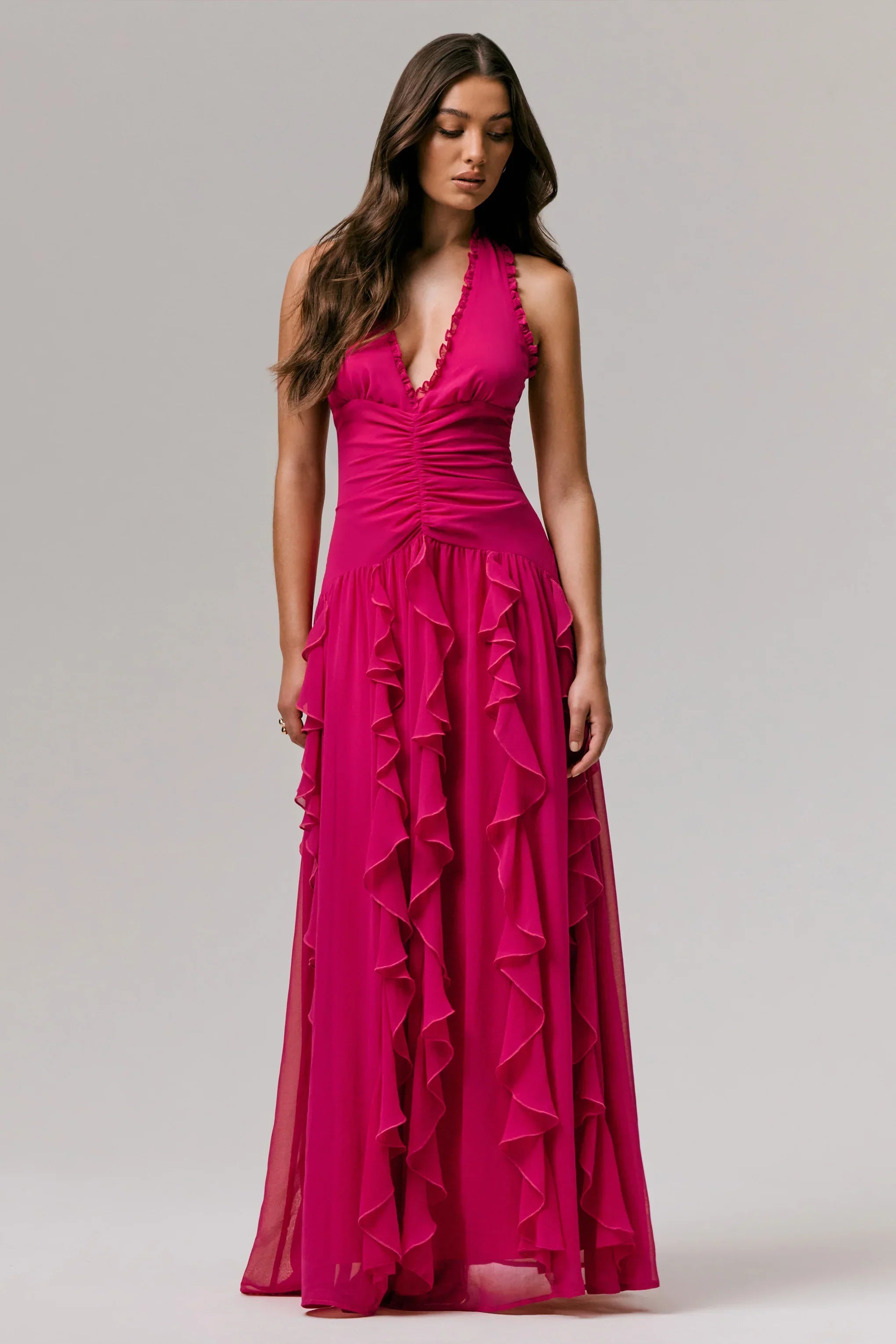 Turn every entrance into a moment with Bea, the dress made to mesmerise. Crafted from our premium chiffon in a bold hot pink hue, this head-turning maxi is the perfect balance of flirty and sophisticated. Featuring a plunge halter neckline trimmed with delicate frills, Bea brings romantic drama to the forefront. The ruched bodice and angled drop waist seamlessly sculpt your silhouette, while the cascading frilled skirt adds graceful movement with every step. Finished with a sultry scoop back, this look is all about confident femininity. Whether you’re at a destination wedding or a black-tie gala, Bea was made for the spotlight.