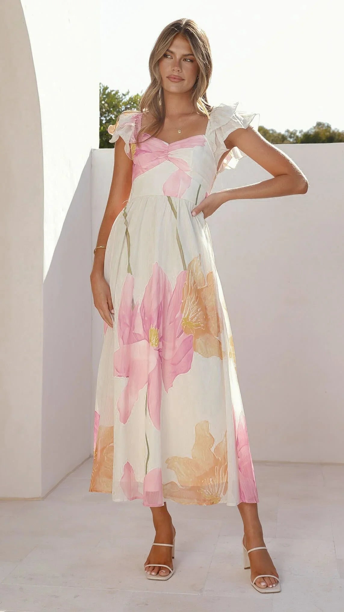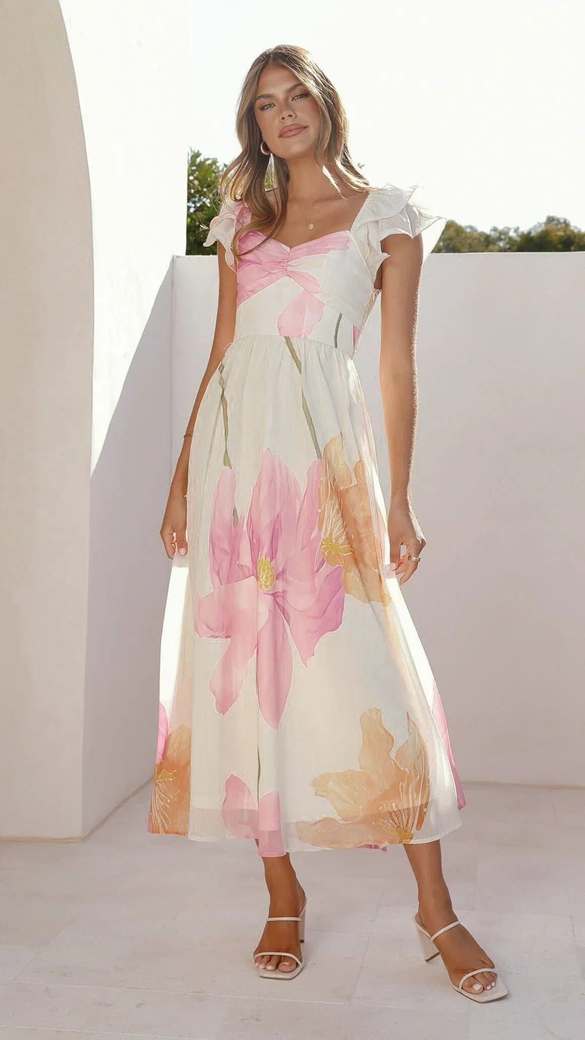 The Claire Maxi Dress in Wildflower Floral features a flattering sweetheart neckline and delicate gather detail at the bust, enhancing its elegant silhouette. Designed with elasticated shoulders, it offers a comfortable yet refined fit. The lined dress is finished with an invisible side zip for a seamless look and charming frill sleeve details that add a touch of sophistication and femininity to this maxi-length piece.