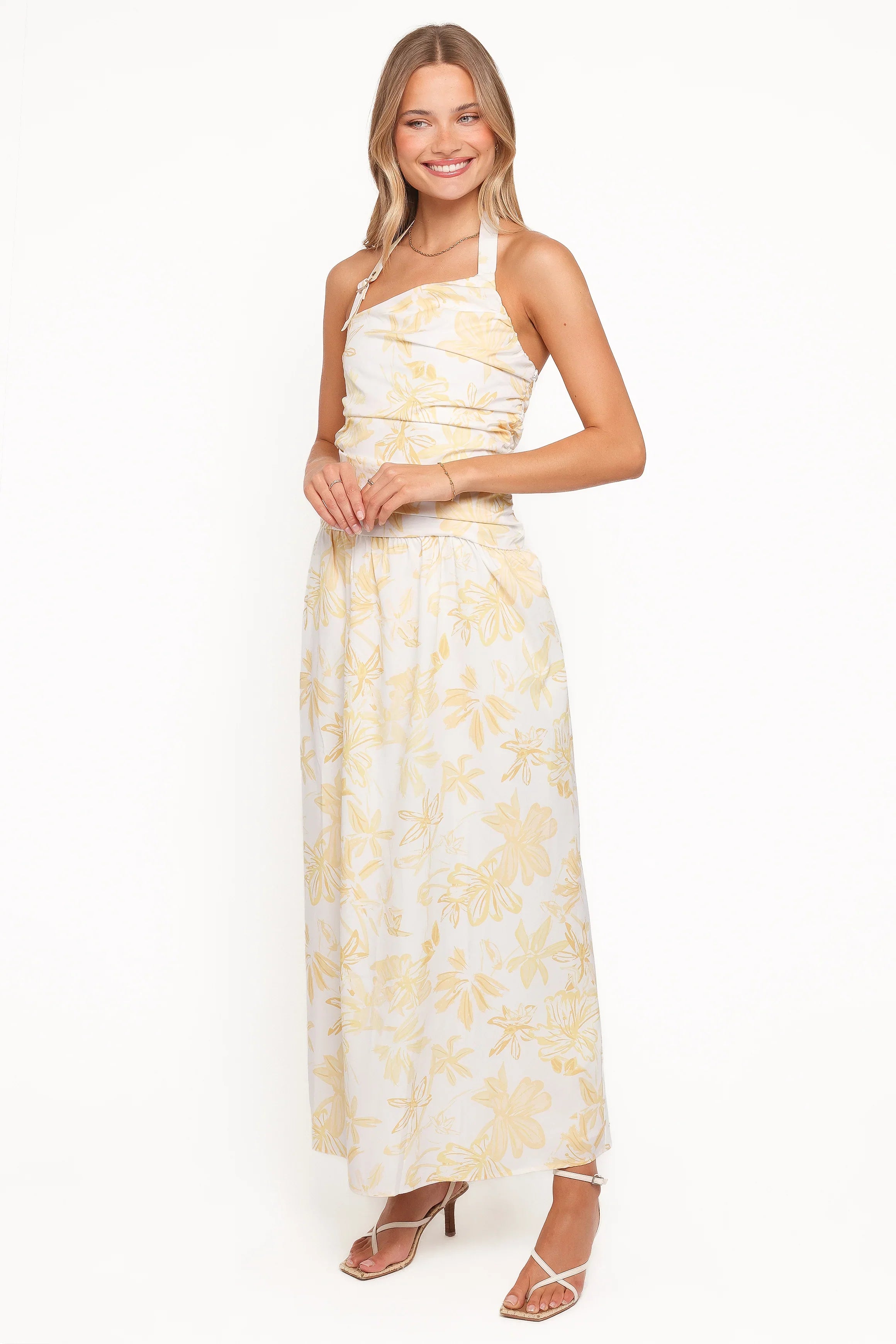 Make a radiant entrance with the Jemma Halter Maxi Dress. This stunning piece features a vibrant yellow floral print that's perfect for sun-drenched days and warm evenings. Its graceful maxi length creates a flowing silhouette, while the halterneck, complete with an adjustable buckle, ensures a perfect fit.
